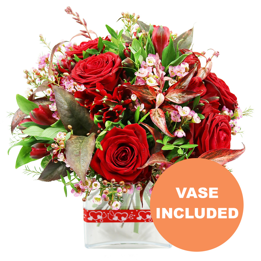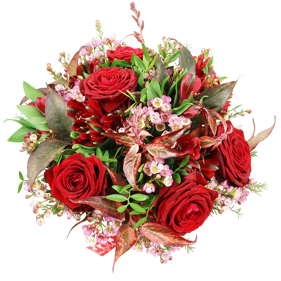 Indulge in beauty with our stunning bouquet, featuring vibrant red roses, exquisite red alstroemeria, delicate wax flowers, rich pistacia, and lush red greenery. Each flower is hand-selected to ensure top-notch freshness and quality, creating a unique and captivating floral arrangement.