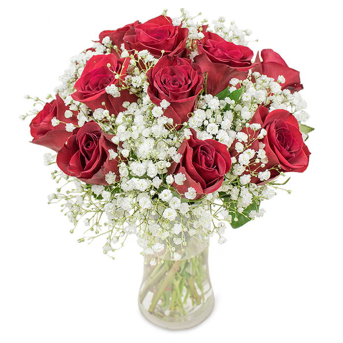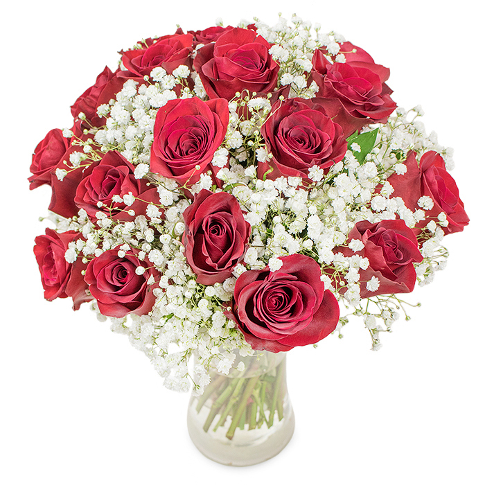 Is there a better way to show your devotion than this classic? Gorgeous red roses accompanied by white gypsophila would leave your special one breathless.