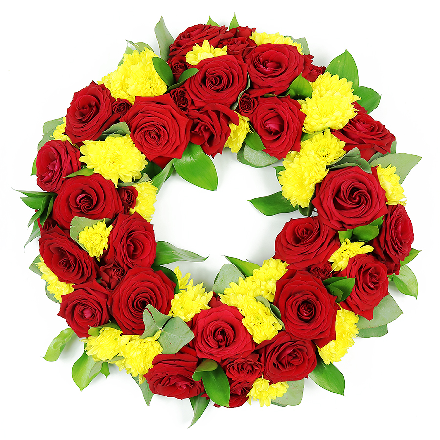 Our Eternal Remembrance Wreath is a heartfelt tribute designed to honor the everlasting spirit of your loved one. This exquisite arrangement features a vibrant mix of yellow chrysanthemums, red roses, and lush greenery, expertly handcrafted by our florists to create a beautiful and unique display.