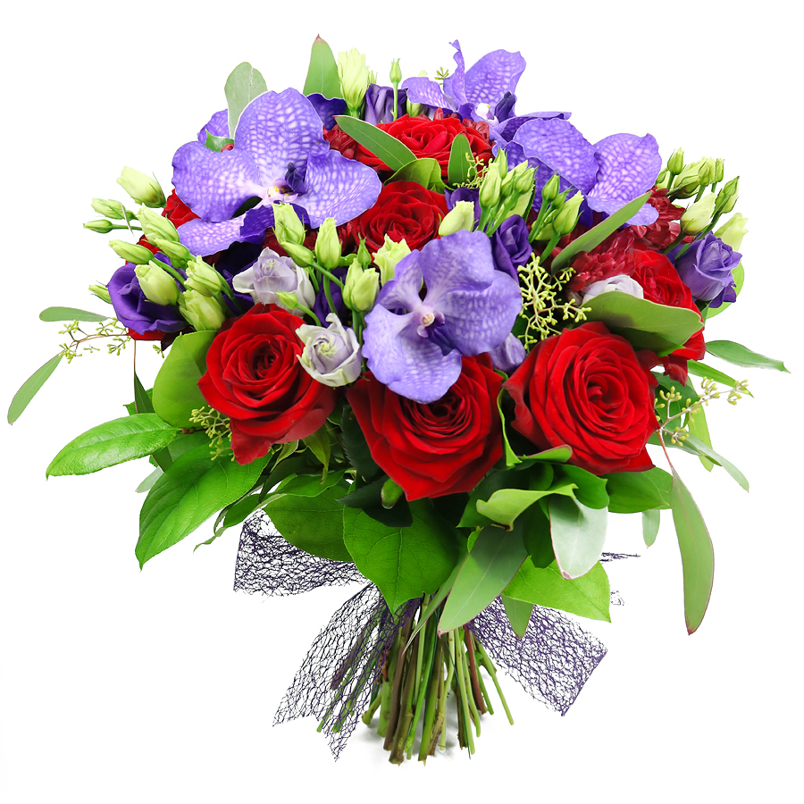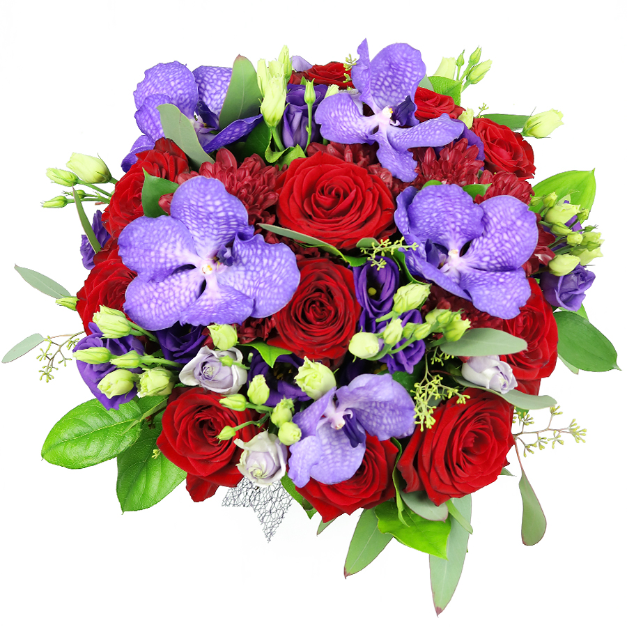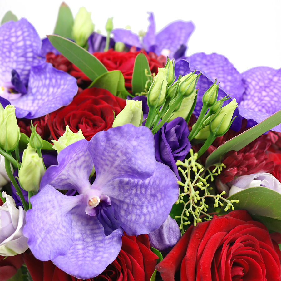 Immerse yourself in the romantic allure of our bouquet, featuring passionate red roses and striking purple vanda. This unique arrangement radiates elegance and timeless romance, making it a perfect gift to express your deepest feelings.
