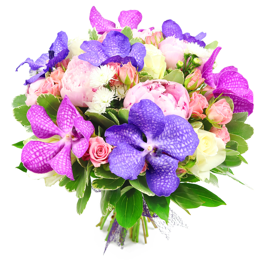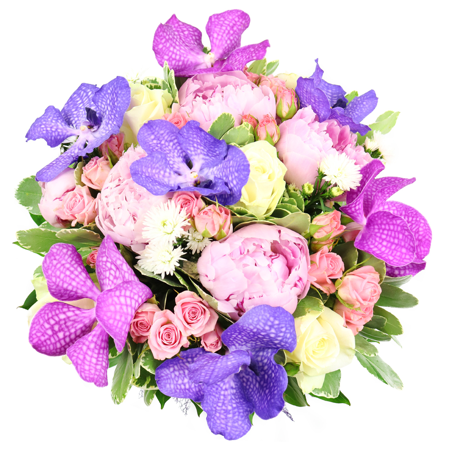 Bring joy with our radiant bouquet, featuring a stunning combination of pink vanda and purple blossoms. The loosely arranged flowers create a flowy, garden-fresh appearance, ideal for any meaningful occasion.