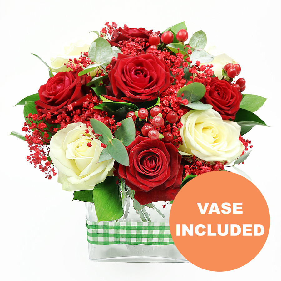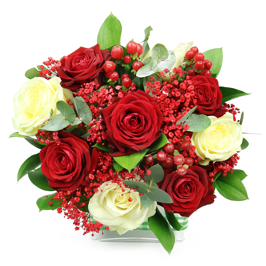 Brighten any occasion with our remarkable floral arrangement that exudes elegance and charm. Luxury & Uniqueness: Our bouquet artfully combines the passionate tone of red roses with the pure allure of white roses, enriched with red hypericum, red gypsophila, and natural greenery.