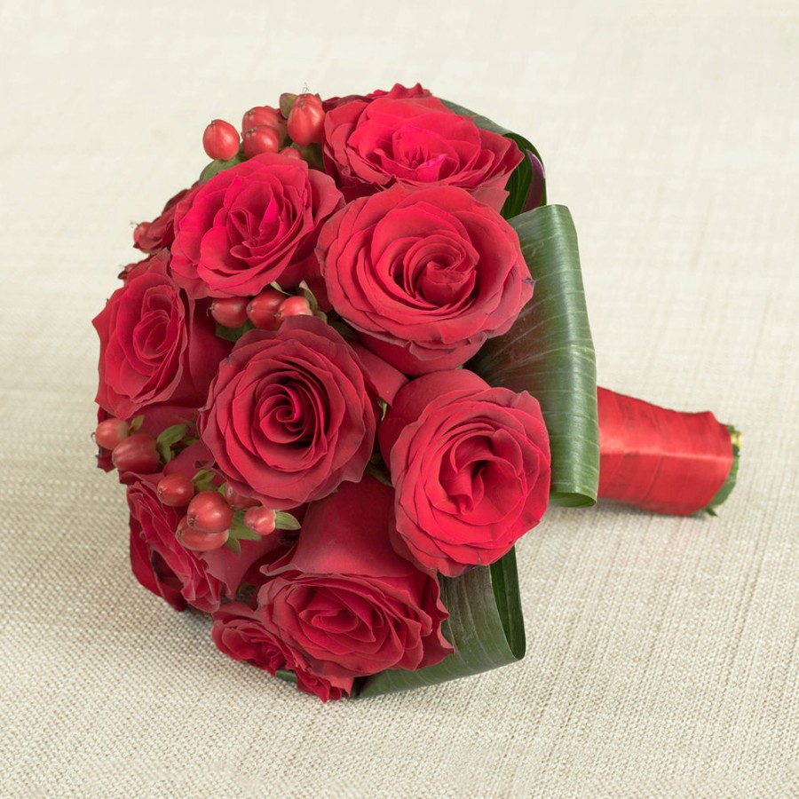 Bridal Bouquet Royal Essence is a perfect addition to every extravagant bride's look. This vividly colorful composition captures the essence of deep scarlet roses with magnificent red hypericum. Aspidistra green leaves sharpen even more the sophisticated royal origin of this beauty.