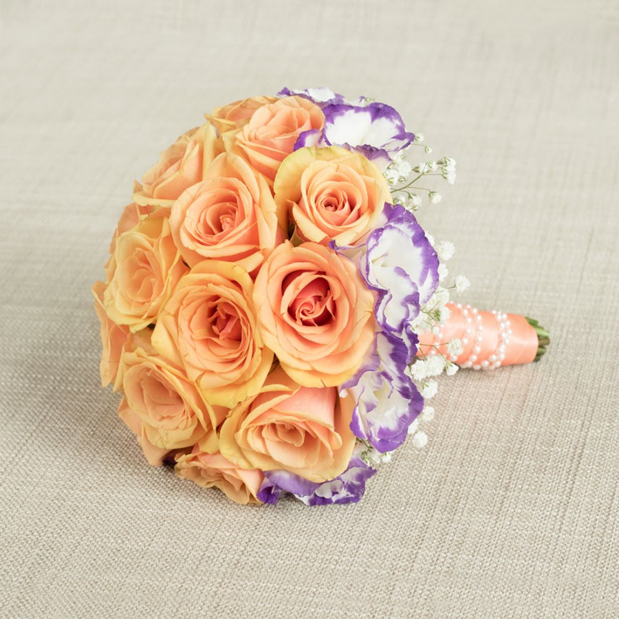 This adorable bridal bouquet boasts a glorious combination of sweet peach Orange Roses, White-purple Lisianthus and Gypsophila presented in an unforgettable way. Accent your beauty in a stylish way!