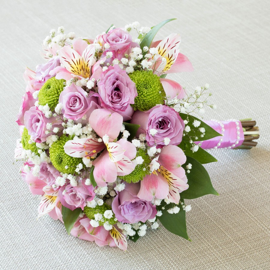 Enhance your wedding with the Sincerely Yours Bridal Bouquet, a captivating mixpurple roses, pink-purple alstroemeria, green mini chrysanthemums, gypsophila, and aralia leaves. Each flower is hand-picked to ensure utmost freshness and beauty.
