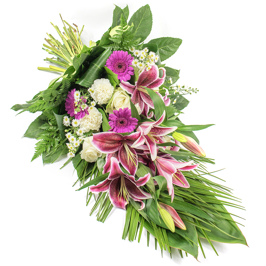 Dark pink gerbera, purple liliums and white roses are combined with white carnations and gypsophila to create this spray of grace. It is an appropriate flower arrangement to honour your great loss.