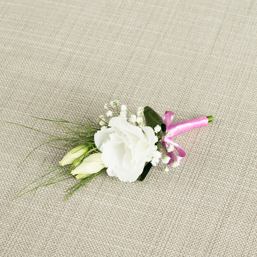 Enhance your wedding attire with our sophisticated groom buttonhole, meticulously arranged with white lisianthus, gypsophila, and aspidistra leaves. This beautiful design adds a touch of elegance to your ensemble.