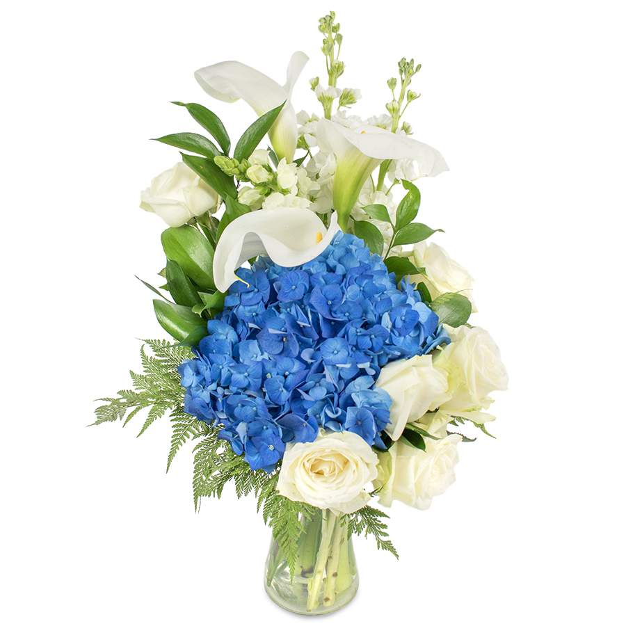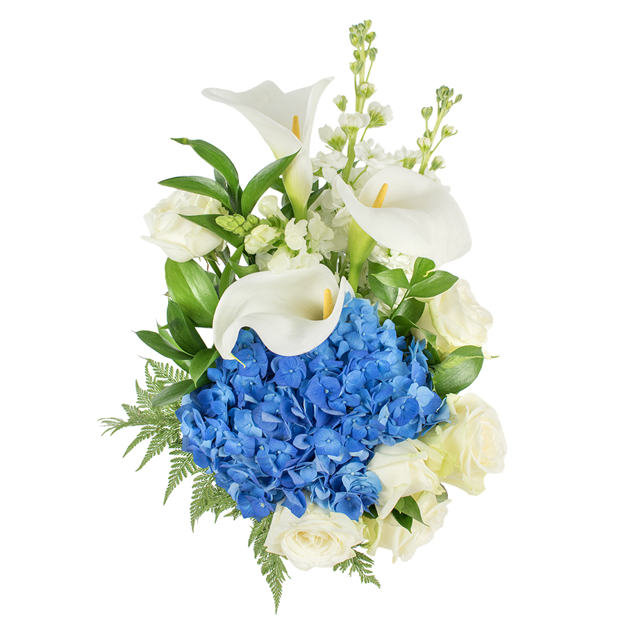Celebrate special moments with our pure elegance bouquet, featuring a stunning combination of white calla lilies, serene blue hydrangea, timeless white roses, and fragrant white stock flowers. Each flower is hand-selected to ensure the highest quality and freshness.